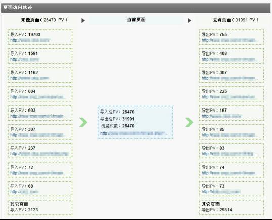 訪客經(jīng)常在網(wǎng)站中的各個頁面之間跳轉(zhuǎn),訪問的路徑不勝枚舉,但可以通過觀察焦點頁面及其上下游頁面,掌握訪客的來路和去向,發(fā)現(xiàn)較普遍的訪客訪問習慣。頁面訪問軌跡即用來完成該功能,用戶可自由指定觀察焦點頁面,系統(tǒng)會列出該頁面的前十位來路頁面和去向頁面。對觀察焦點頁面而言,其自身的導入、導出PV的多少能夠反映出該頁面在網(wǎng)站的權(quán)重地位,而通過觀察來源和去向頁面又能最大限度的了解到訪客的行為習慣及興趣點。