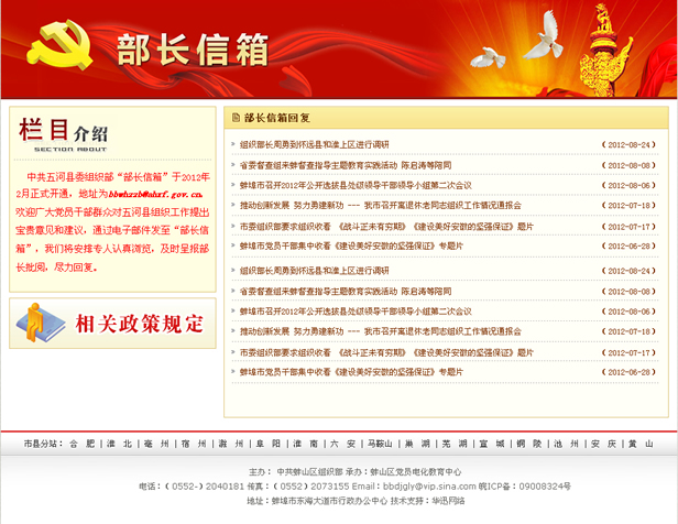 中共五河縣委組織部“部長(zhǎng)信箱”于2012年2月正式開通,地址為bbwhzzb@ahxf.gov.cn。歡迎廣大黨員干部群眾對(duì)五河縣組織工作提出寶貴意見(jiàn)和建議,通過(guò)電子郵件發(fā)至“部長(zhǎng)信箱”,我們將安排專人認(rèn)真瀏覽,及時(shí)呈報(bào)部長(zhǎng)批閱,盡力回復(fù)。